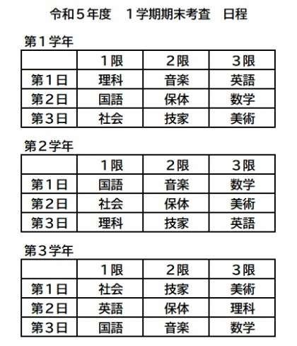 6月26日(月)〜6月28日(水)の3日間、1学期期末考査を実施します。先週月曜日からテスト期間に入り、MC(Media Control)ウィーク、TJS学習規律徹底週間の取組を進めてきました。いよいよテスト当日です。学校や家庭で取り組んできた学習の成果を十分に発揮してください。一生懸命に取り組むこととともに、「発揮する力」は様々な分野であなたを成功へと導いてくれます。頑張れ、月中生!