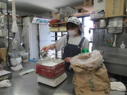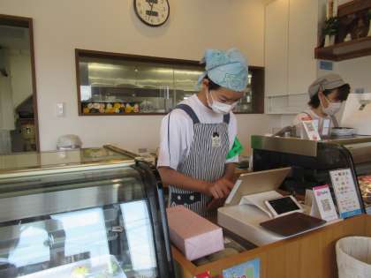 榎屋では、接客・レジ操作・材料の軽量、ゼラチンを溶かす作業等を行っていました。事業所の方の明るい雰囲気の中、緊張しながらも楽しそうに接客や計量をしていました。