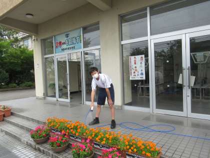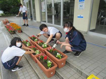 菓子処榎屋と富山市立図書館本館のグループは、本日事業所の活動が休みのため、中学校で環境整備活動を行いました。生徒玄関前のプランターがリニューアルされました。