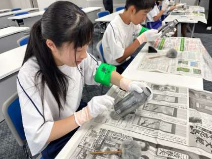 「14歳の挑戦」 7月6日 富山南警察署 公開日 2023/07/06 更新日 2023/07/06 学び合い認め合う学習 富山南警察署では、鑑識の体験をしていました。ライトで足跡を調べたり缶についた指紋を採取したりしながら真剣に活動に取り組んでいました。