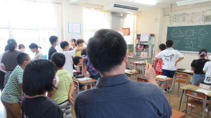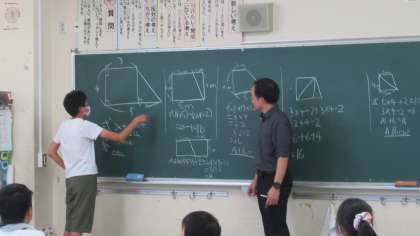 7月21日(金)小中連携「月岡小出前授業」(その3) 公開日 2023/07/24 更新日 2023/07/24 学び合い認め合う学習 小学校6年生、中学校数学科教員による体験授業の様子です。今日は、円や台形等の図形について学習しました。