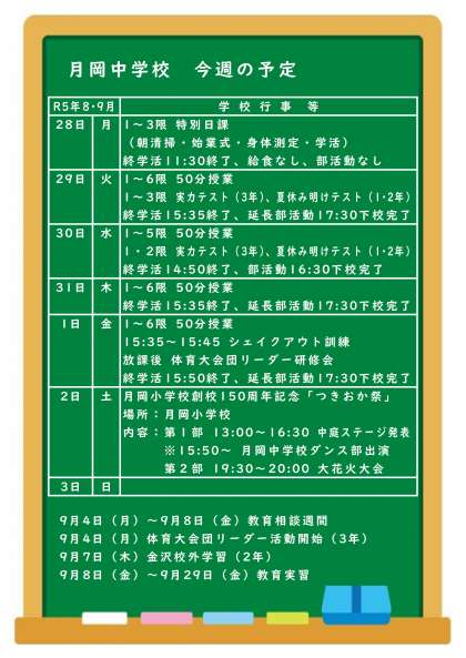 今年の夏は、例年になく猛暑が続いています。また、夏休み明けで心身共にまだまだ学校生活のリズムに慣れていないことと思います。無理をし過ぎず、心と身体のコンディショニングに努めましょう。