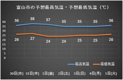 気象庁によると、明日、明後日は最高気温が38度、37度となり、その後も最高気温が35度を超える猛暑日が続くようです。
