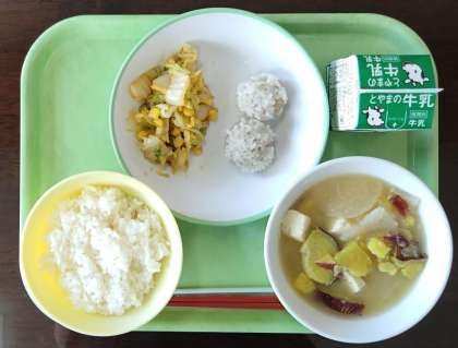 ごはん 牛乳 珍珠丸子 コーン和え さつま汁 でした。