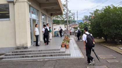 9月12日(火)朝の登校風景(その2) 公開日 2023/09/12 更新日 2023/09/12 その他 降り出した雨もすぐに止み、途中からは傘の必要もなくなりました。天気予報では午後から雨マークとなっていますが、何とかグラウンドで部活動ができることを期待しています。