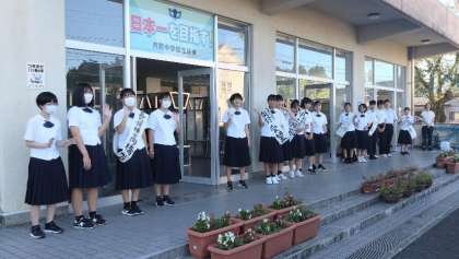 9月13日(水)生徒会役員選挙 〜選挙運動開始〜 公開日 2023/09/13 更新日 2023/09/13 生徒の活動紹介 「おはようございます!」秋晴れの朝を迎えました。 今朝から生徒会役員選挙に向けた選挙運動が始まりました。生徒玄関前では立候補者とその応援スタッフが登校する生徒たちに「おはようございます。」「よろしくお願いします。」と笑顔で元気に声をかけていました。立会演説会と投票は、9月21日(木)に行われます。