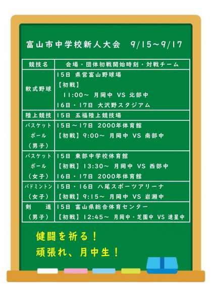 富山市中学校新人大会 〜月岡中学校 試合日程〜 公開日 2023/09/15 更新日 2023/09/15 部活動 9月15日(金)に月岡中学校が出場する初戦の試合日程は、次の通りです。皆さん、応援よろしくお願いします!