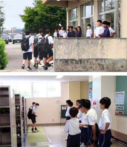 生徒会執行部が企画する「月中enjoy!!あいさつ運動」も第3日となり、本日担当する生活班の皆さんと登校する生徒たちが元気に朝の挨拶を交わしていました。また、本日より体育大会に向けた団練習、学年練習、全体練習等が開始され、体育服での登下校が可能となります。体育館ではすでに団練習の準備が整えられていました。