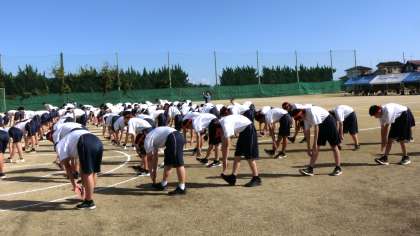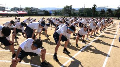 音楽に合わせてストレッチ体操を行いながら、ウォーミングアップ。
