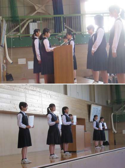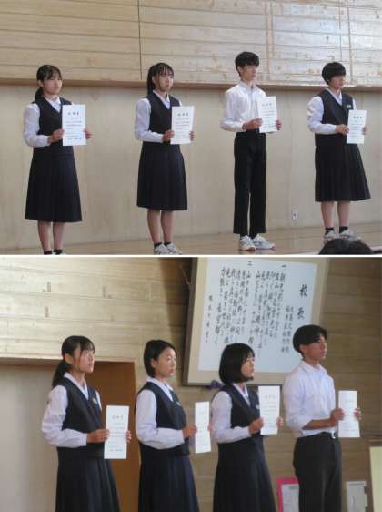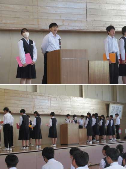 10月13日(金)生徒会役員任命式・委員長委嘱式 公開日 2023/10/17 更新日 2023/10/17 学び合い認め合う学習 本日1限に令和5年度後期・令和6年度前期の生徒会役員任命式・委員長委嘱式を行いました。スローガン「一語一笑」のもと、3年生が中心となって活動してきた生徒会。いよいよ2年生が中心となって企画・運営し、輝き続ける月岡中学校を目指していきます。 (上:新役員 中:新委員長 下:新旧役員・委員長引き継ぎの様子)