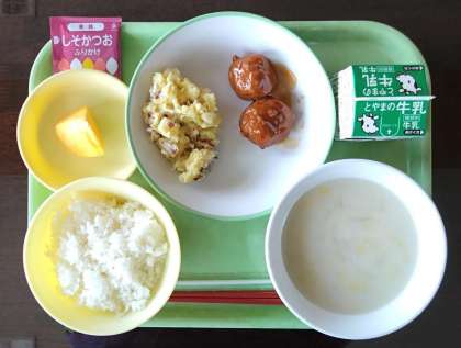 「チーズおさつ」は、蒸したさつまいもにチーズと牛乳を加えて甘く味付けした料理で、カルシウムをたっぷり含んだ一品です。ミートボールとの相性もよく、ごはんがよく進みました。