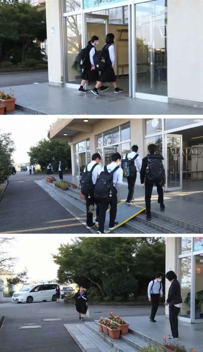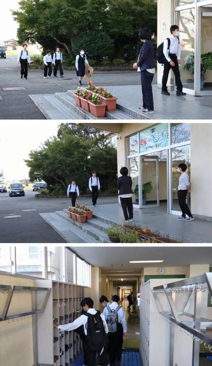 10月19日(木)朝の登校風景 公開日 2023/10/19 更新日 2023/10/19 その他 「おはようございます!」爽やかな秋晴れの朝となりました。 徒歩通学生、自転車通学生、自家用車送迎による通学生ともに事故等なく安全に登校してきました。安心・安全な登下校について、ご家庭での様々なご配慮に心から感謝いたします。