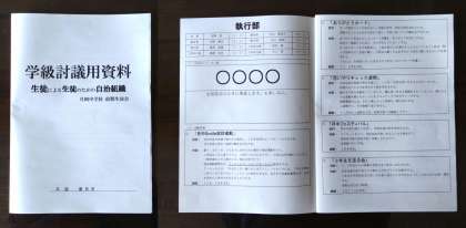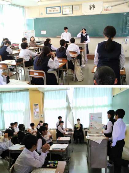 画像は、学級討議の打合せをする生徒会役員と学級代表、そして1年生の学級討議の様子です。