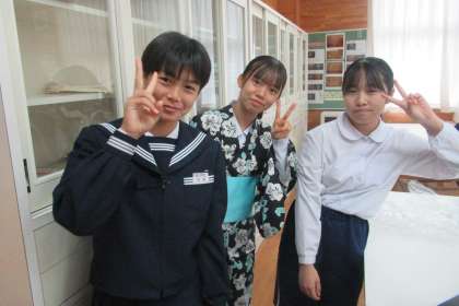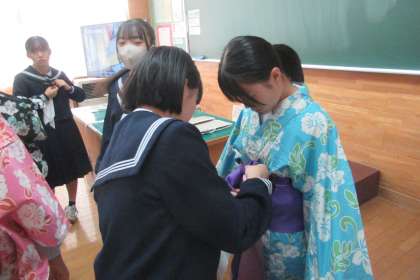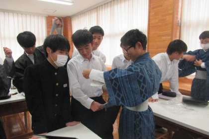 11月2日(木)授業の様子 〜家庭科〜(その2) 公開日 2023/11/06 更新日 2023/11/06 学び合い認め合う学習 2学年の家庭科の授業の様子です。各グループで試行錯誤しながら和服の着付けに挑戦しました。