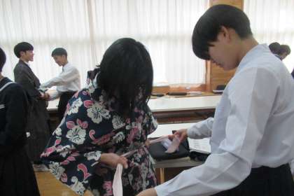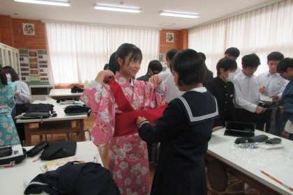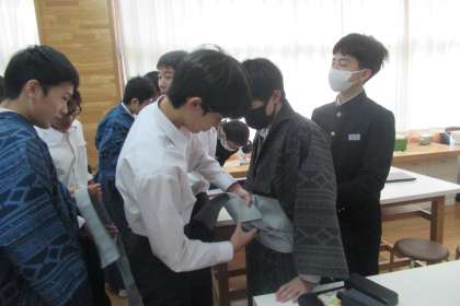 11月2日(木)授業の様子 〜家庭科〜(その1) 公開日 2023/11/06 更新日 2023/11/06 学び合い認め合う学習 2学年の家庭科では「日本の衣服について調べてまとめよう」という課題に取り組んでいます。日本の伝統的な和服についてクロームブックを活用して調べ、レポートにまとめました。今日の授業では、実際に和服を準備し、動画等の資料を参考にしながらグループで着付けを行いました。