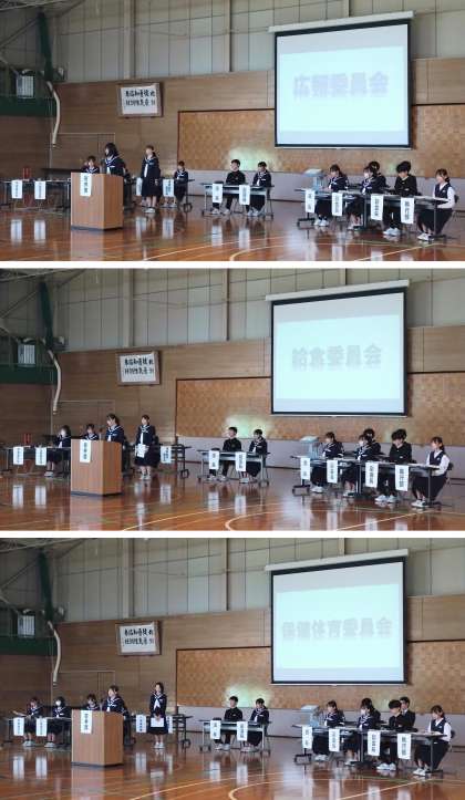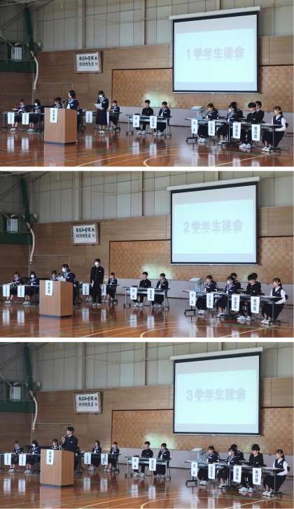 執行部、専門委員会、学年生徒会の活動について、副会長、委員長、学年代表が説明しました。学級討議で提出された質問・意見・修正案については、その回答が分かりやすくスクリーン上に示され、これを受けてすべての説明終了後に質疑応答が行われます。