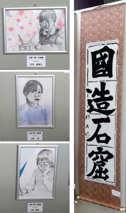 画像は、開会式、作品展示(美術、書道、手芸・被服)の様子です。