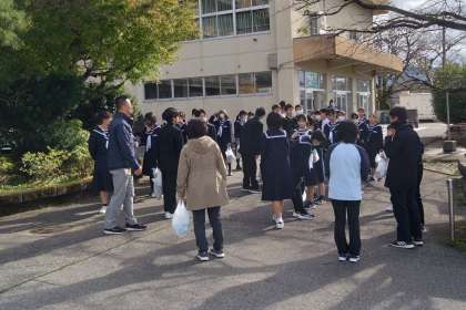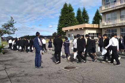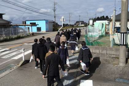 11月14日(火)月岡小・中合同芸術鑑賞会(その1) 公開日 2023/11/15 更新日 2023/11/15 学び合い認め合う学習 本日5限・6限に「月岡小・中合同芸術鑑賞会」を開催しました。演題は「川村亘平斎の影絵と音楽の世界」。影絵師(音楽家)、ガムラン・パーカッション奏者、スティールパン奏者の3名による光と影の織りなす幻想的な雰囲気を楽しみ、美しさを味わいながら、芸術としての影絵に親しみたいと思います。 月岡中学校を徒歩で出発し、会場の月岡小学校体育館に向かいます。