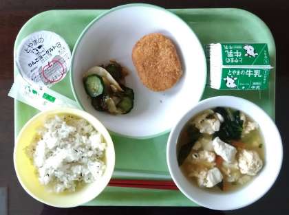 今日の献立は「とやまミートコロッケ」や「とろろ昆布和え」等、『とやま』を感じることができるメニューでした。