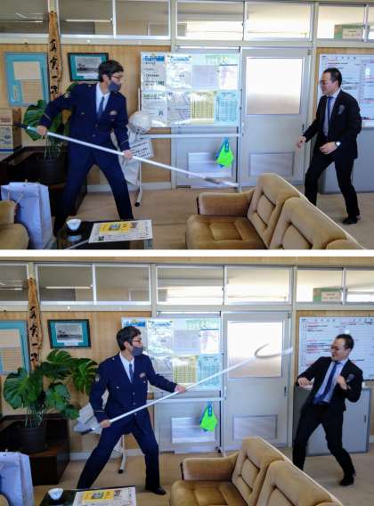 「刺股」の使い方を指導していただきました。下方から上方へ振り上げるように動かすことで、先端の2点が目の位置に迫ってくるように使うのがポイントです。
