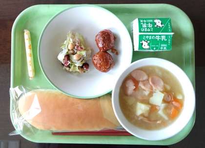 11月27日(月)本日の給食 公開日 2023/11/27 更新日 2023/11/27 その他 本日の給食メニューは・・・、 コッペパン 牛乳 ミートボール 棒チーズ ミックスビーンズのマリネ 野菜のスープ煮 でした。 「野菜のスープ煮」は、様々な野菜とベーコンが混ざり合い、コクのある美味しいスープとなっていました。 今日もおいしい給食を楽しくいただきました。ありがとうございました!