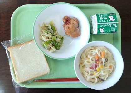 12月11日(月)本日の給食 公開日 2023/12/12 更新日 2023/12/12 その他 本日の給食メニューは・・・、 食パン(減) 牛乳 照焼きチキン 切干大根のサラダ クリームスパゲッティ でした。 「クリームスパゲッティ」は、スパゲッティが他の具材とともに濃厚なクリームソースとしっかり絡み、深い味わいを出していました。 今日もおいしい給食を楽しくいただきました。ありがとうございました!