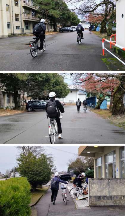 自転車通学生のヘルメット姿は交通安全リーダーの証です。素晴らしい!