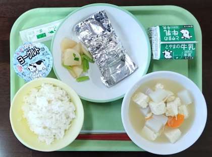 12月15日(金)本日の給食 公開日 2023/12/15 更新日 2023/12/15 その他 本日の給食メニューは・・・、 ごはん 牛乳 さばの銀紙焼き かぶの色どり 打ち豆汁 ヨーグルト でした。 「さばの銀紙焼き」は、さばの切り身を甘みそとともにアルミホイルで包み、蒸して仕上げる料理です。ごはんとの相性もピッタリ。昔ながらの給食メニューです。 今日もおいしい給食を楽しくいただきました。ありがとうございました!