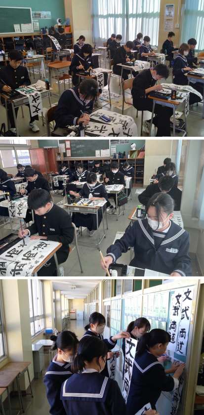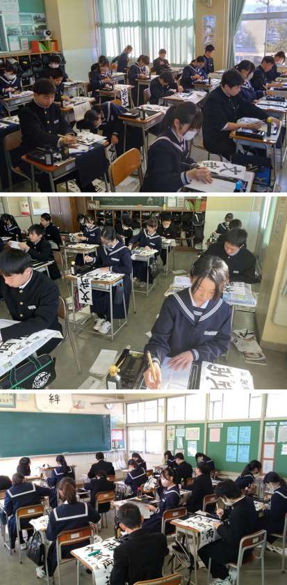本日2限に書き初め大会を行いました。生徒たちは、新年のフレッシュな気持ちを一筆一筆に託しながら、真剣なまなざしで取り組んでいました。