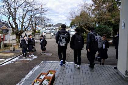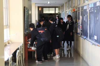 1月9日(火)下校の様子(その1) 公開日 2024/01/10 更新日 2024/01/10 その他 11時30分、終学活が終了しました。 この後は帰宅し、昼食を食べて・・・、きっと明日のテストに向けて学習に取り組む生徒がほとんどだと思います。 頑張れ、月中生!