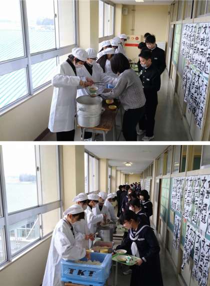 4限の授業が終了し、1年生が素早く給食準備に取りかかっていました。