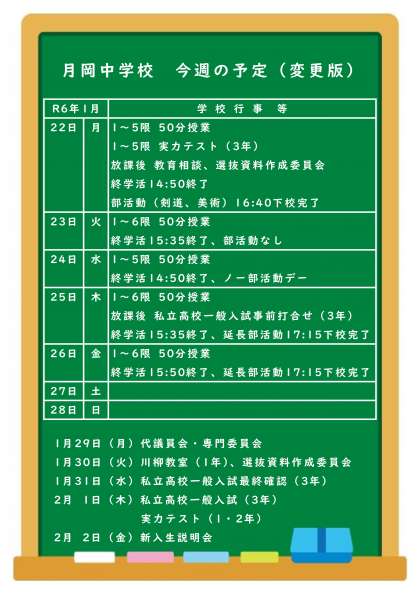 1月22日(月)〜1月28日(日)の予定(変更版)を掲載します。