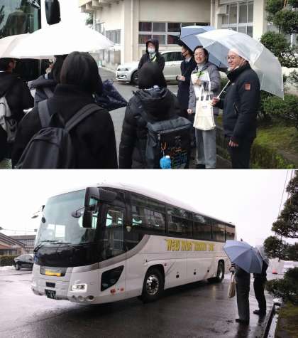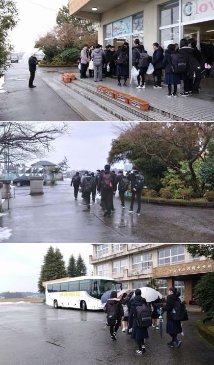 本日、富山県内の私立高校で一斉に一般入試が実施され、受験生は5教科の学力テストに臨みます。今朝は貸切バスで入試会場まで移動する生徒たちが生徒玄関前に集合し、点呼の後、元気に学校を出発していきました。