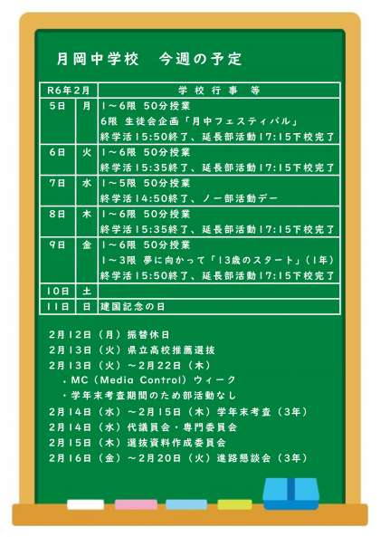 今週の予定 公開日 2024/02/05 更新日 2024/02/05 週案 2月5日(月)〜2月12日(日)の予定です。 今週は、5日(月)に生徒会企画「月中フェスティバル」、9日(金)に夢に向かって「13歳のスタート」(1年生)が行われます。 雪の少ない冬となっていますが、寒暖差が大きいことから、体調管理には十分に気を配りながら生活をしていきたいものです。