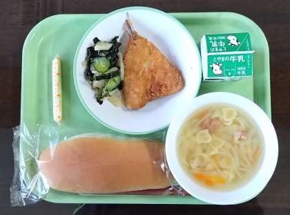 2月5日(月)本日の給食 公開日 2024/02/05 更新日 2024/02/05 その他 本日の給食メニューは・・・、 コッペパン 牛乳 あじフライ 大根サラダ マカロニスープ 棒チーズ でした。 「あじフライ」は、新鮮なあじがサクサク感たっぷりに揚げられており、味とともに食感も味わうことができました。 今日もおいしい給食を楽しくいただきました。ありがとうございました!