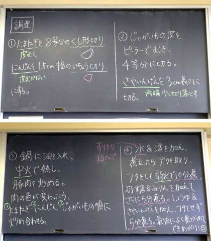 2月9日(金)授業の様子 〜家庭科 調理実習〜(その1) 公開日 2024/02/14 更新日 2024/02/14 学び合い認め合う学習 今週から来週にかけて、全学年で家庭科の調理実習を実施しています。 学習課題「おいしい肉じゃがを作ろう」のもと、生徒たちは班のメンバーと協力しながら、準備から調理、試食、片付け、振り返りまで、実習授業に楽しく取り組んでいました。
