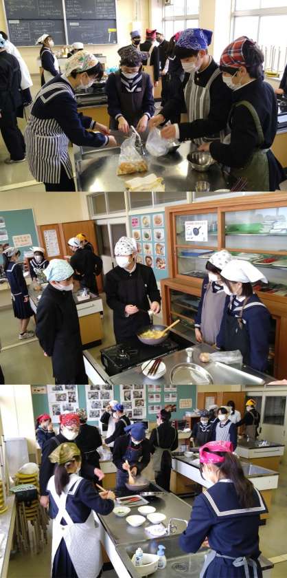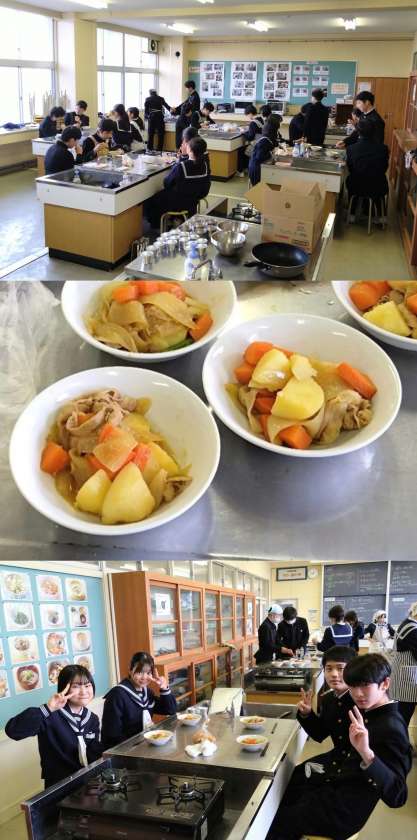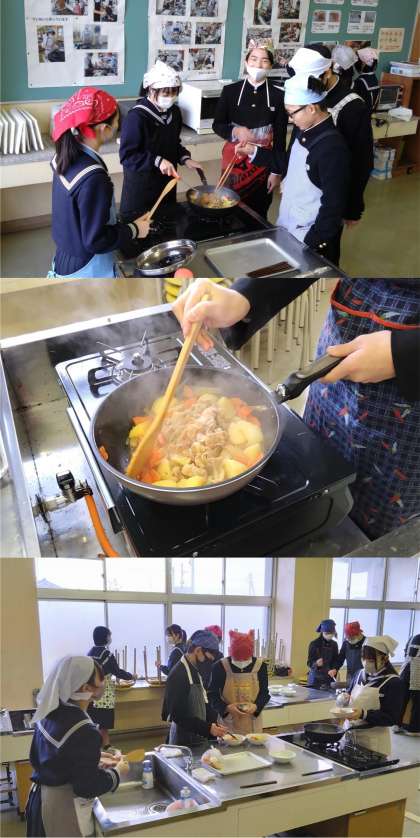 2月15日(木)授業の様子 〜家庭科 調理実習〜 公開日 2024/02/16 更新日 2024/02/16 学び合い認め合う学習 家庭科の授業では先週から今週にかけて、学習課題「おいしい肉じゃがを作ろう」のもと全学年で調理実習を実施しています。今週は2年生が実習授業に取り組み、班のメンバーと協力しながら、おいしい肉じゃがの完成を目指しました。