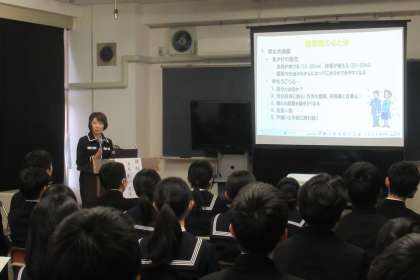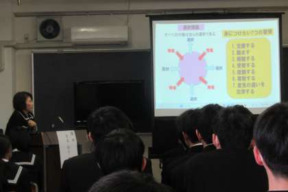 2月27日(火)産婦人科医による講話【2年生】(その2) 公開日 2024/02/28 更新日 2024/02/28 学び合い認め合う学習 思春期の心と体について、見かけの変化や揺れ動く心、身に付けたい7つの習慣(支援する、励ます、傾聴する、受容する、信頼する、尊敬する、意見の違いを交渉する)、その他様々な内容を丁寧に分かりやすく講義していただきました。