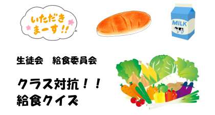 昨日から生徒会の給食委員会の企画活動「クラス対抗!!給食クイズ」の取組が始まっています。お昼の校内放送「It's lunch time」の中でクイズを出題し、クラス対抗で問題を解いてもらいながら、より楽しく給食を食べてもらうことが目的です。出題された問題を紹介します。