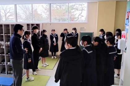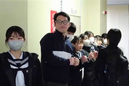今回の「月中 Smile 挨拶運動」は、部活動ごとに分担をして取り組んでいます。第1日は陸上競技部1・3年と美術部、第2日は陸上競技部2年と茶道部、第3日はバスケットボール部とコンピュータ部、本日第4日はバドミントン部とダンス部、明日最終日は野球部と剣道部、無所属の生徒の皆さんが担当しています。