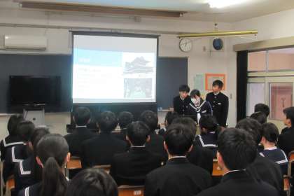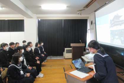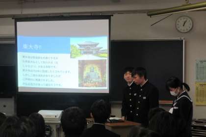 2月29日(木)学年集会 〜修学旅行に向けて〜【2年生】 公開日 2024/03/01 更新日 2024/03/01 学び合い認め合う学習 本日5限に来年度実施予定の修学旅行に向けた学年集会を行いました。今回は、前回までの「京都」「大阪」に続いて、担当グループが「奈良」の見所や食文化等を紹介し、クイズ形式で理解を深めました。