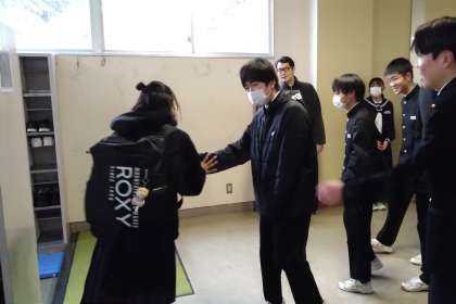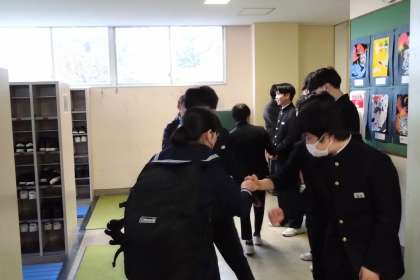 「おはようございます!」の声とともに、グータッチやハイタッチ。生徒玄関前の廊下には、明るい挨拶の輪が広がっていました。
