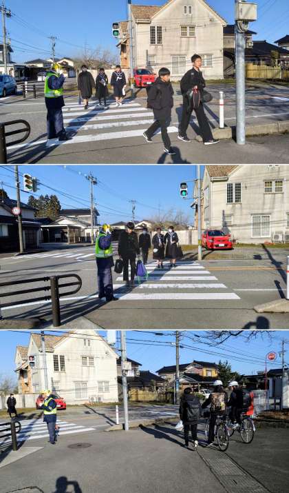 3月11日(月)朝の登校風景(その1) 公開日 2024/03/12 更新日 2024/03/12 その他 「おはようございます!」 快晴の朝を迎えました。冷え込みが強く、今朝の最低気温は−2度。路面の水溜まりには氷が張っていました。