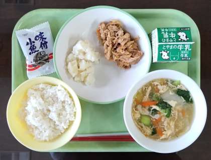 3月13日(水)本日の給食 公開日 2024/03/15 更新日 2024/03/15 その他 本日の給食メニューは・・・、 ごはん 牛乳 豚肉のキムチ炒め こふきいも 中華かきたま汁 味付け小魚 でした。 3年生にとっては、9年間の給食もいよいよ最終日となりました。 名残はつきません・・・。 今日もおいしい給食を楽しくいただきました。ありがとうございました!