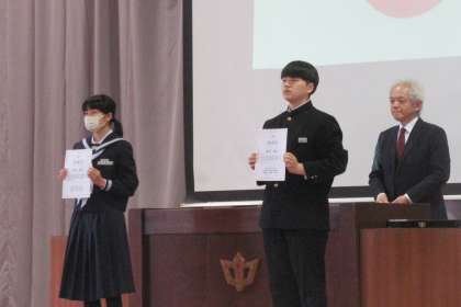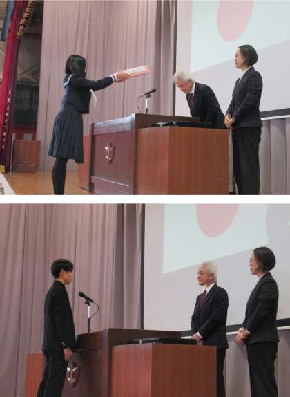 3月13日(水)同窓会入会式 公開日 2024/03/15 更新日 2024/03/15 その他 本日1限に同窓会入会式があり、会長さんの歓迎の挨拶に続いて、記念品贈呈、誓いの言葉、幹事の紹介が行われました。