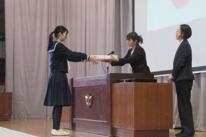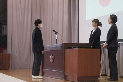 3月13日(水)育友会卒業記念品贈呈式 公開日 2024/03/15 更新日 2024/03/15 その他 同窓会入会式終了後に育友会卒業記念品贈呈式があり、記念品贈呈、卒業生代表の謝辞に続いて、育友会代表の方から卒業に向けたお祝いのメッセージをいただきました。