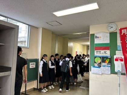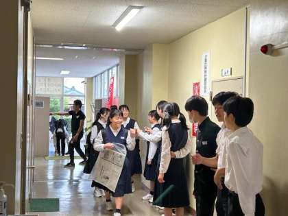 今週、生徒会執行部企画の「月中smile挨拶運動」が始まりました。この活動は、明るい挨拶の輪を広げるためだけでなく、全校生徒が一日を気持ちよくスタートさせるため、ハイタッチやグータッチ、ガッツポーズをしながら挨拶を交わすことで、感謝の気持ちや応援する気持ちを伝え合うことを目的としています。