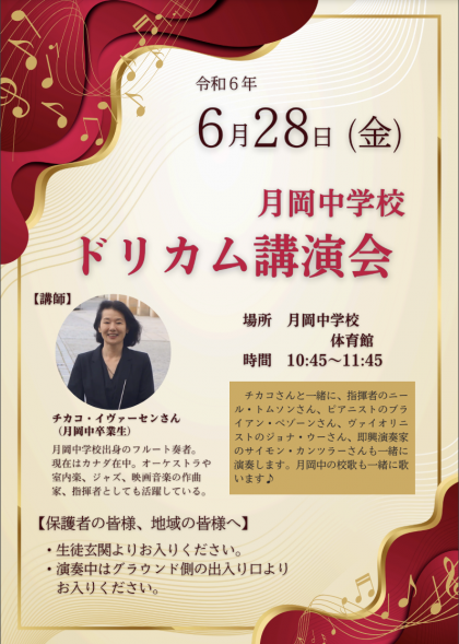 ドリカム講演会のお知らせ 公開日 2024/06/27 更新日 2024/06/27 学び合い認め合う学習 明日28日(金)10:45〜本校体育館でドリカム講演会を行います。 保護者・地域の皆様もお越しいただけます。 ご都合のつく方は、ぜひご覧ください。 講師は本校卒業生でカナダ在住のフルート奏者、チカコ・イヴァーセン様です。