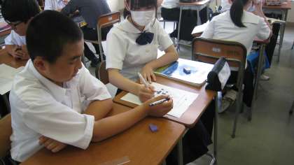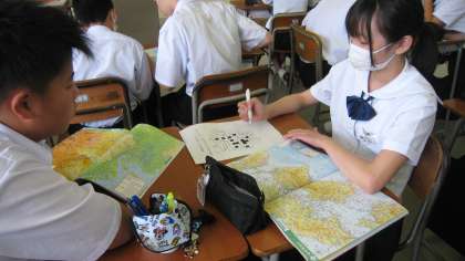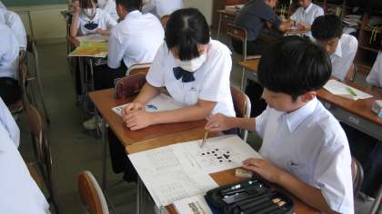 7月17日(水) 1学年脳トレ! 公開日 2024/07/18 更新日 2024/07/18 学び合い認め合う学習 1年生では、記憶力、注意力、推理力を高めるために脳トレをしました。生徒が企画、準備をしてくれました。クロスワードやクイズを班やペアになって、取り組んでいます! 1−1の様子です。