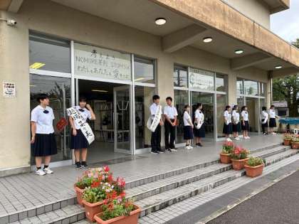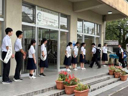 登校時間帯に生徒玄関前で、登校してくる生徒に向け、挨拶や呼びかけを行っていました。